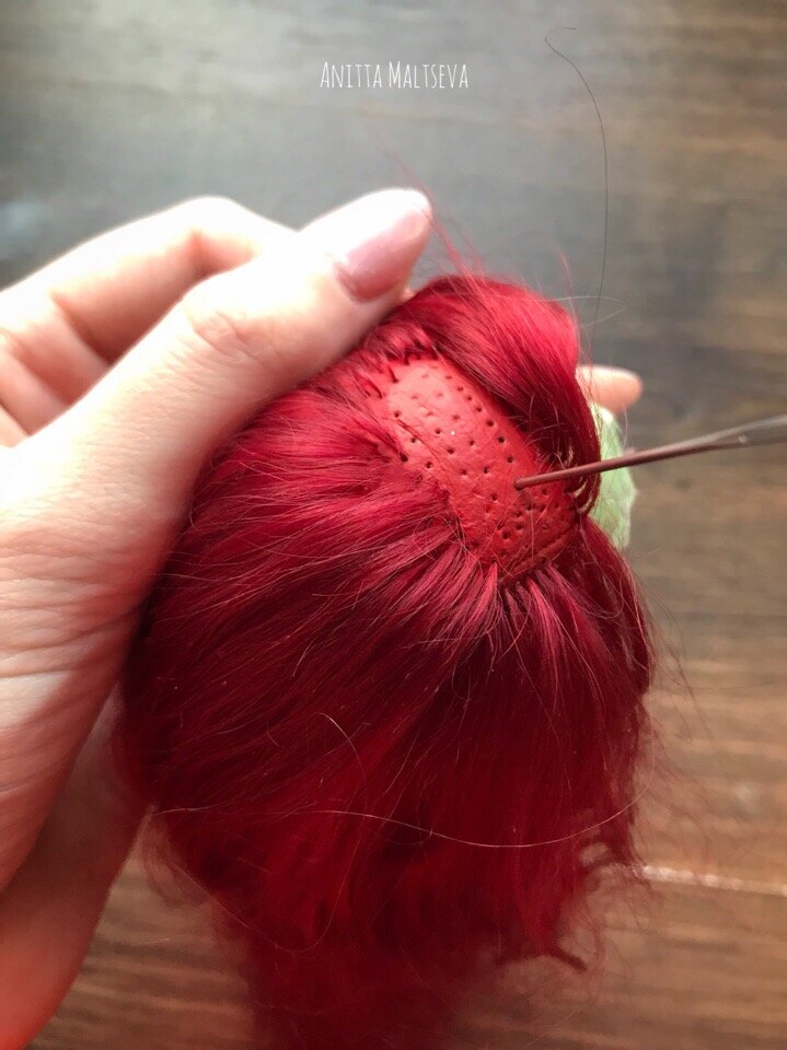 После прошивки головы, тщательно пришейте волосы кукле, чтобы создать естественный и красивый вид.