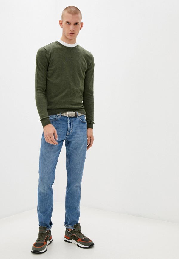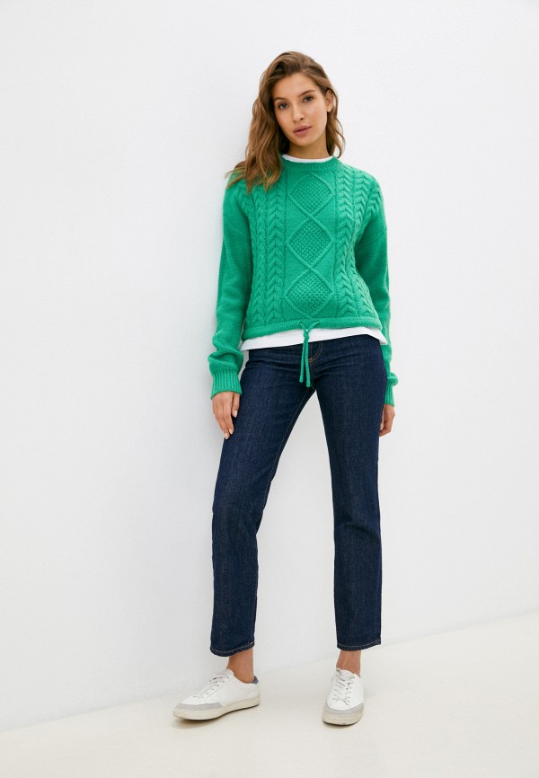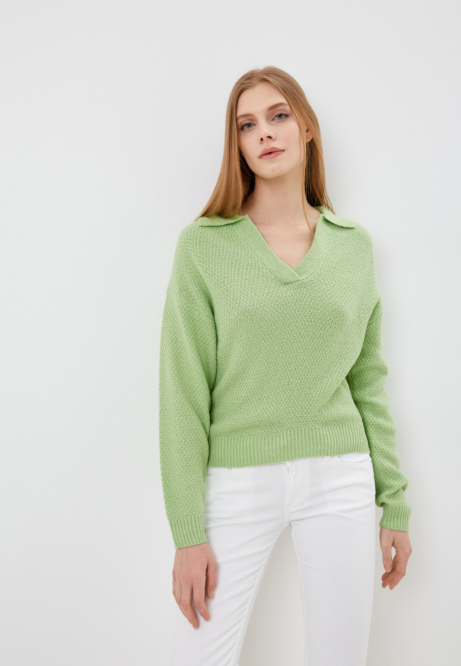 Не бойтесь экспериментировать с текстурами: зеленый свитер от Colins выглядит привлекательно как с гладкими, так и с вязаными тканями.