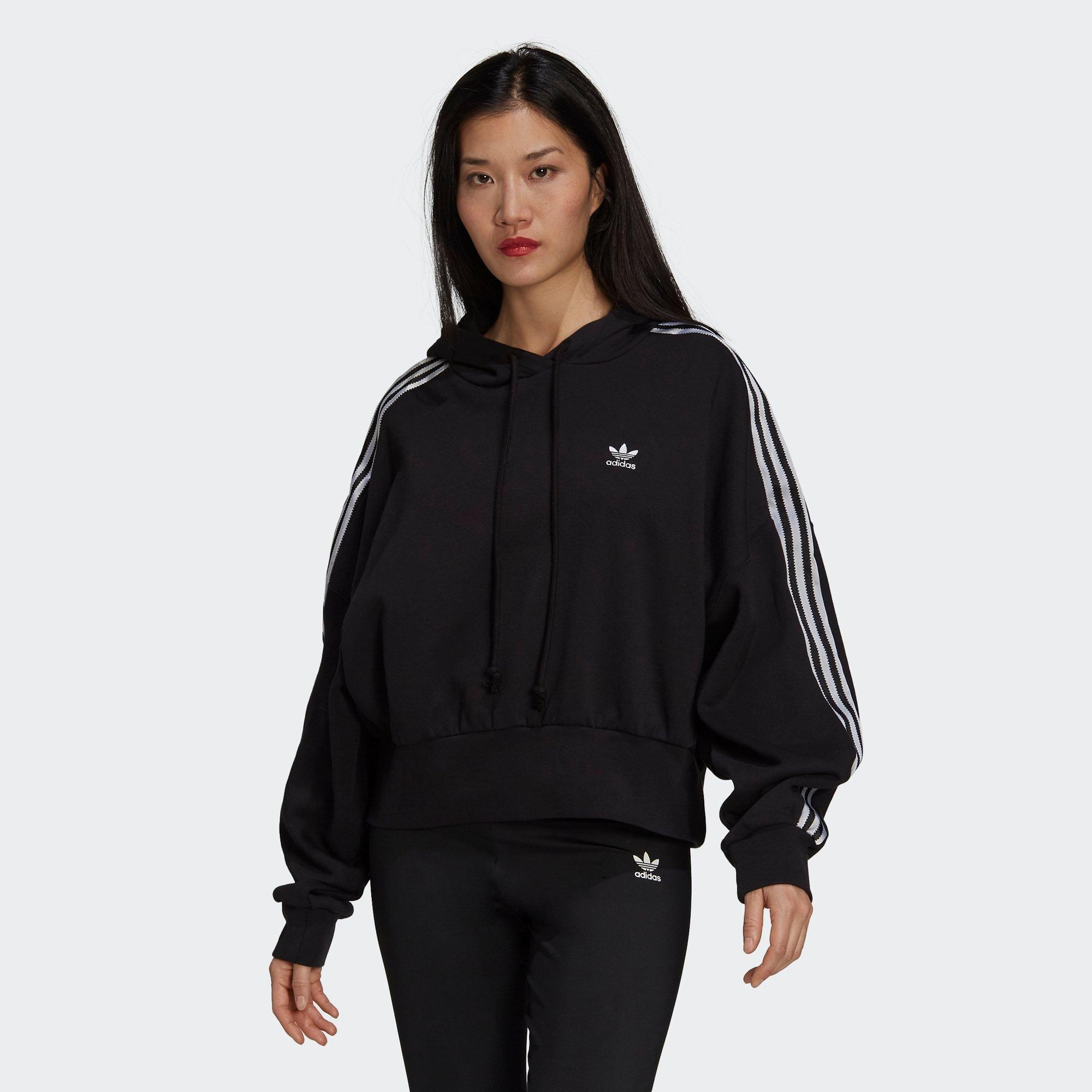Носите черную кофту Adidas с юбкой и ботинками на каблуке для женственного и элегантного вида.