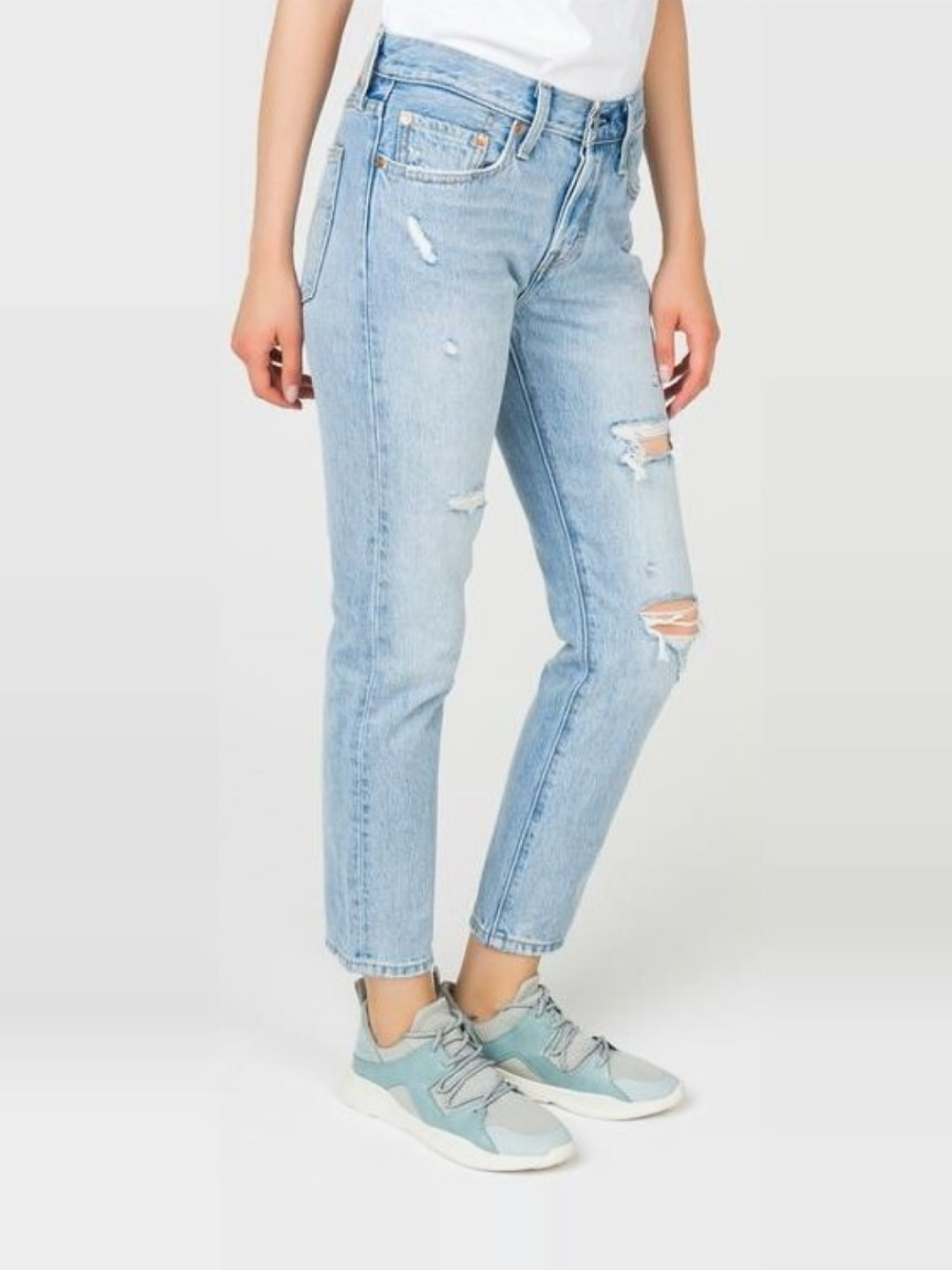 Экспериментируйте с обувью - женские джинсы голубого цвета хорошо сочетаются как с кроссовками, так и с ботинками на каблуке.