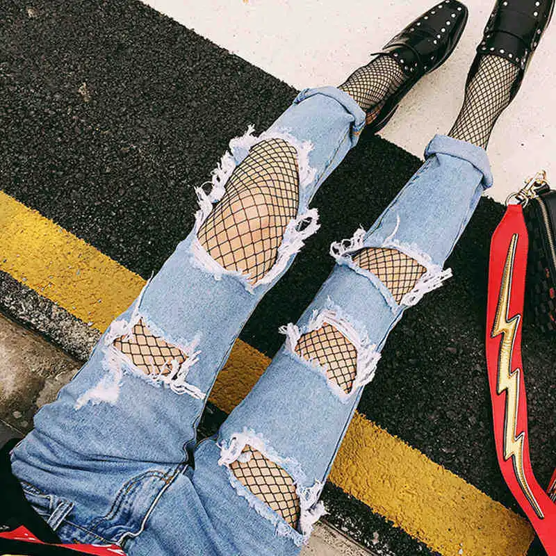 Модные образы с рваными джинсами и сетчатыми колготками