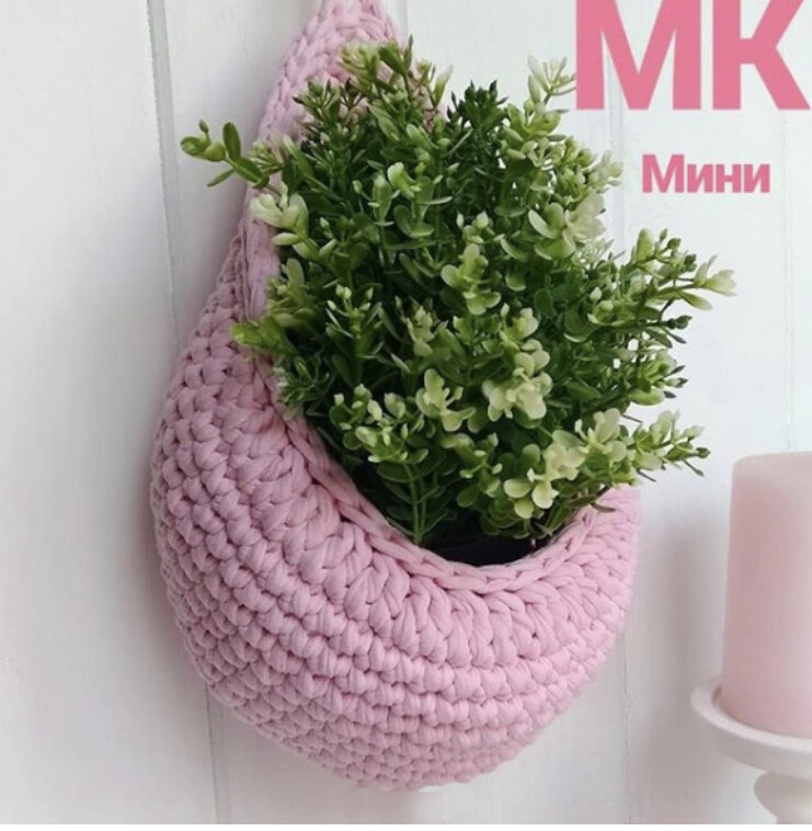подвесная корзинка крючком из трикотажной пряжи, корзинка крючком, вязаная корзинка