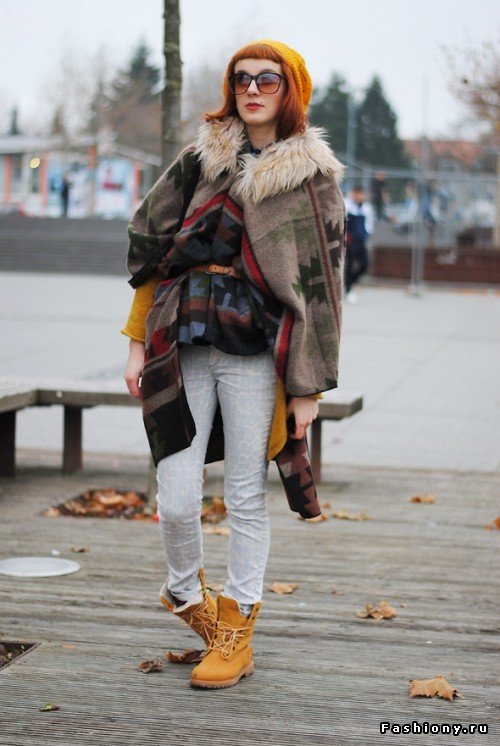 Экспериментируйте с цветами и оттенками: меховая жилетка и тимберленды могут стать основой для разнообразных комбинаций.