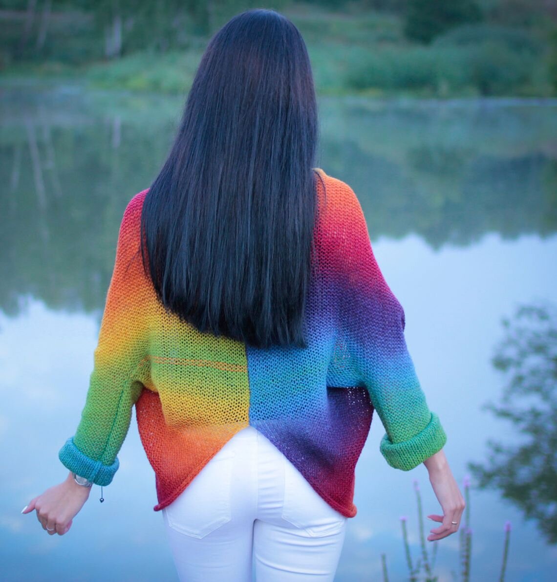 Не забывайте о правильном уходе за свитером из радужной пряжи: стирка в холодной воде и сушка на горизонтальной поверхности помогут сохранить его первозданный вид.
